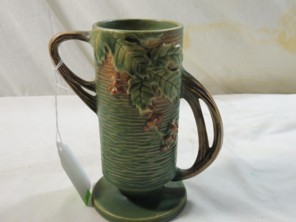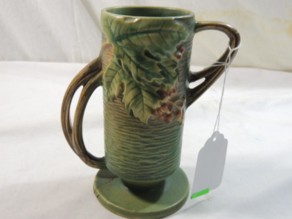 ROSEVILLE POTTERY VASE ACORN LEAF REPAIRED COLLECTIBLE DOUBLE HANDLE VASE AS SHOWN SEE PHOTO FOR MORE DETAILS.