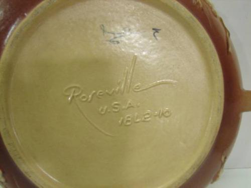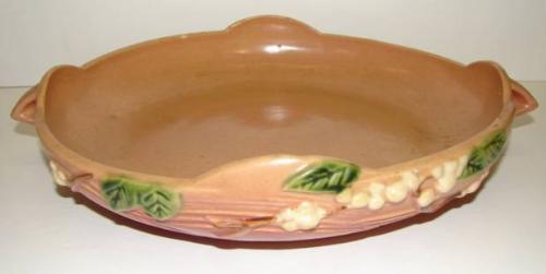 ROSEVILLE SNOWBERRY, 1946 LOW BOWL. Double handles. Shows one chip on underside of one handle. Marked on bottom “Roseville/U.S.A./1BL2-10”. 2.5” H