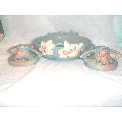 THIS SALE IS FOR ROSEVILLE'S MAGNOLIA CONSOLE BOWL WITH MATCHING CANDLESTICKS. THIS DESIGN WAS PRODUCED IN THE 1940'S AND IS SIGNED 1156-2 FOR THE CANDLESTICKS AND 448-8 FOR THE CONSOLE BOWL. THE CANDLESTICK MEASURES 2 1/2 IN. TALL AND 6 1/2 IN. IN DIAMETER AND THE CONSOLE BOWL MEASURES 2 3/4 IN. TALL AND 8 3/4 IN. IN DIAMETER. ALL PIECES ARE IN VERY GOOD CONDITION.