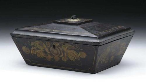 ROSEWOOD GRAIN PAINTED SARCOPHAGUS FORMED BOX. Maine hinge top box has black and red grain painting with stenciled fruit and leaf decoration. Mid 19th Century. SIZE: 5” h x 11” l x 8” w. CONDITION: Very good. 9-27883