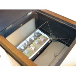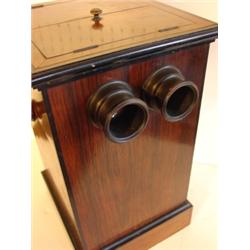 ROSEWOOD STEREO VIEW MACHINE. Two eye holes for viewing with knob on side for rotating view cards. Excellent condition. 17.5" H, 9.75" W, 10.5" D