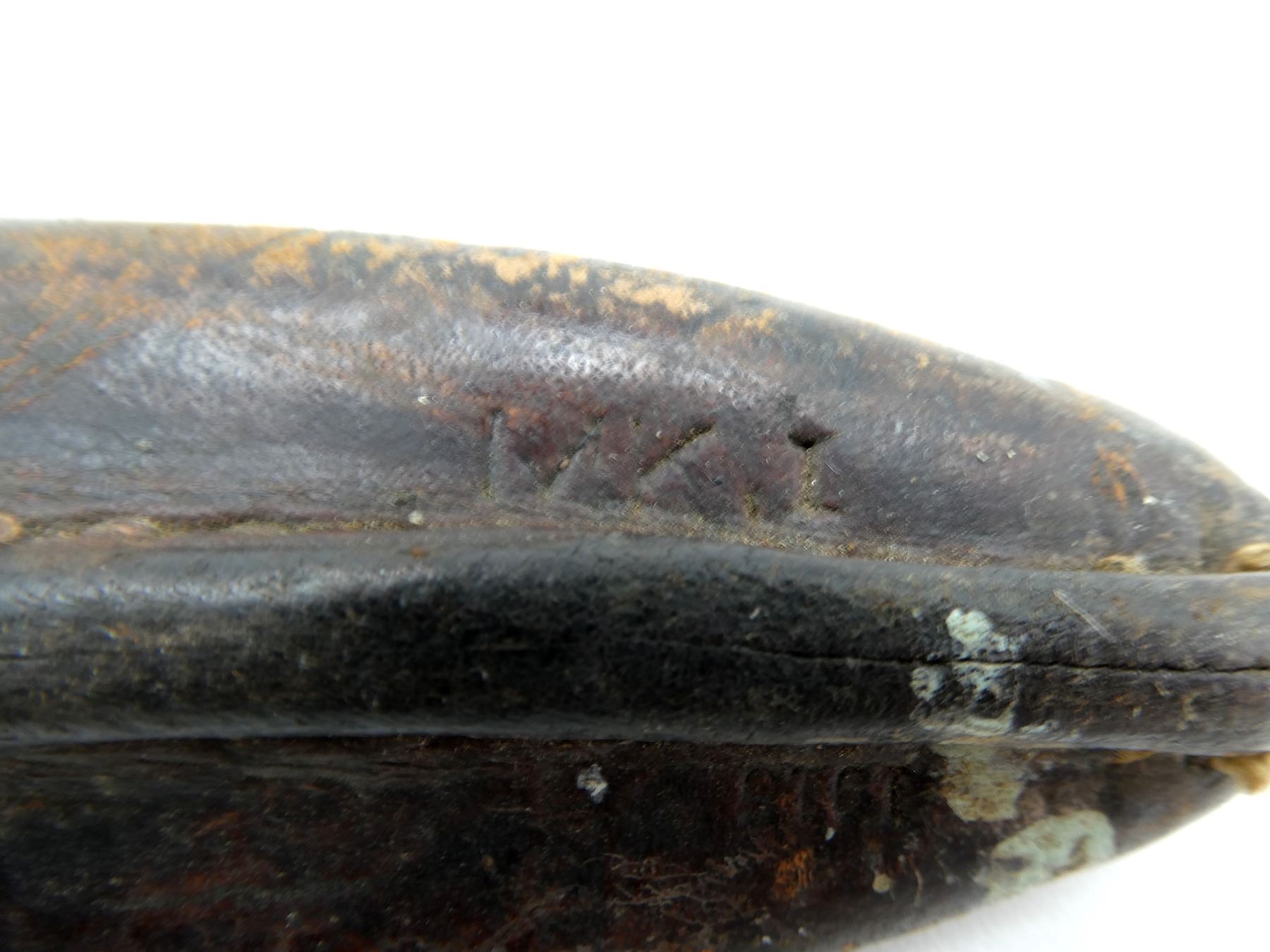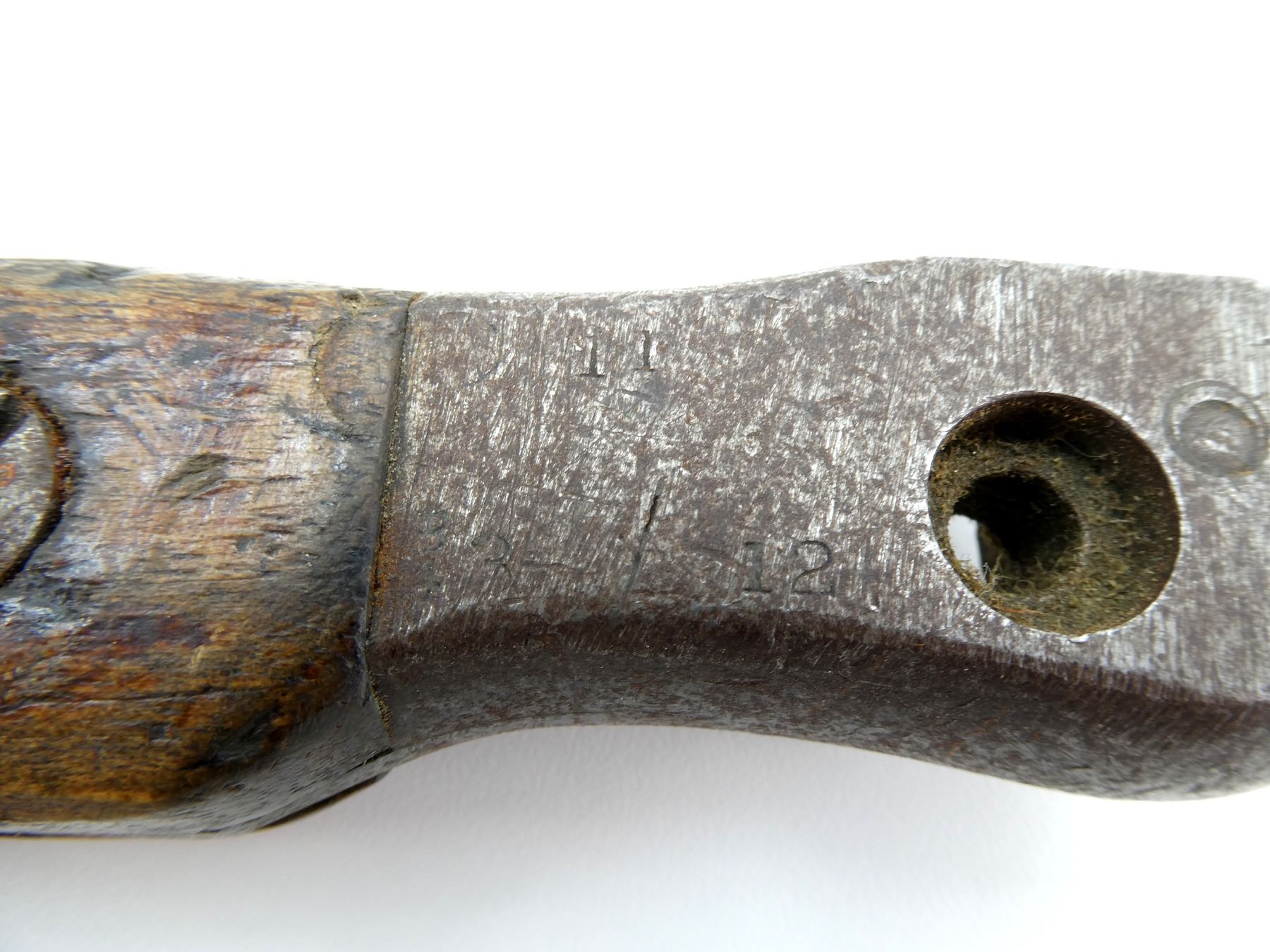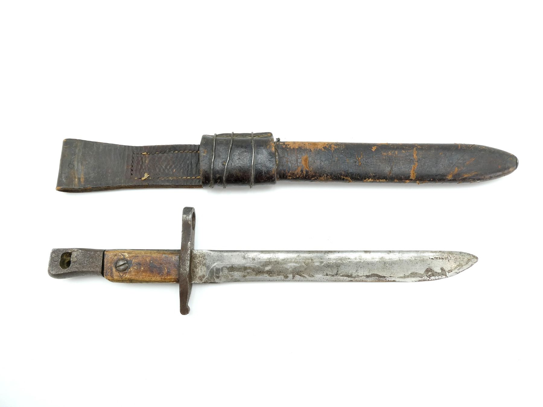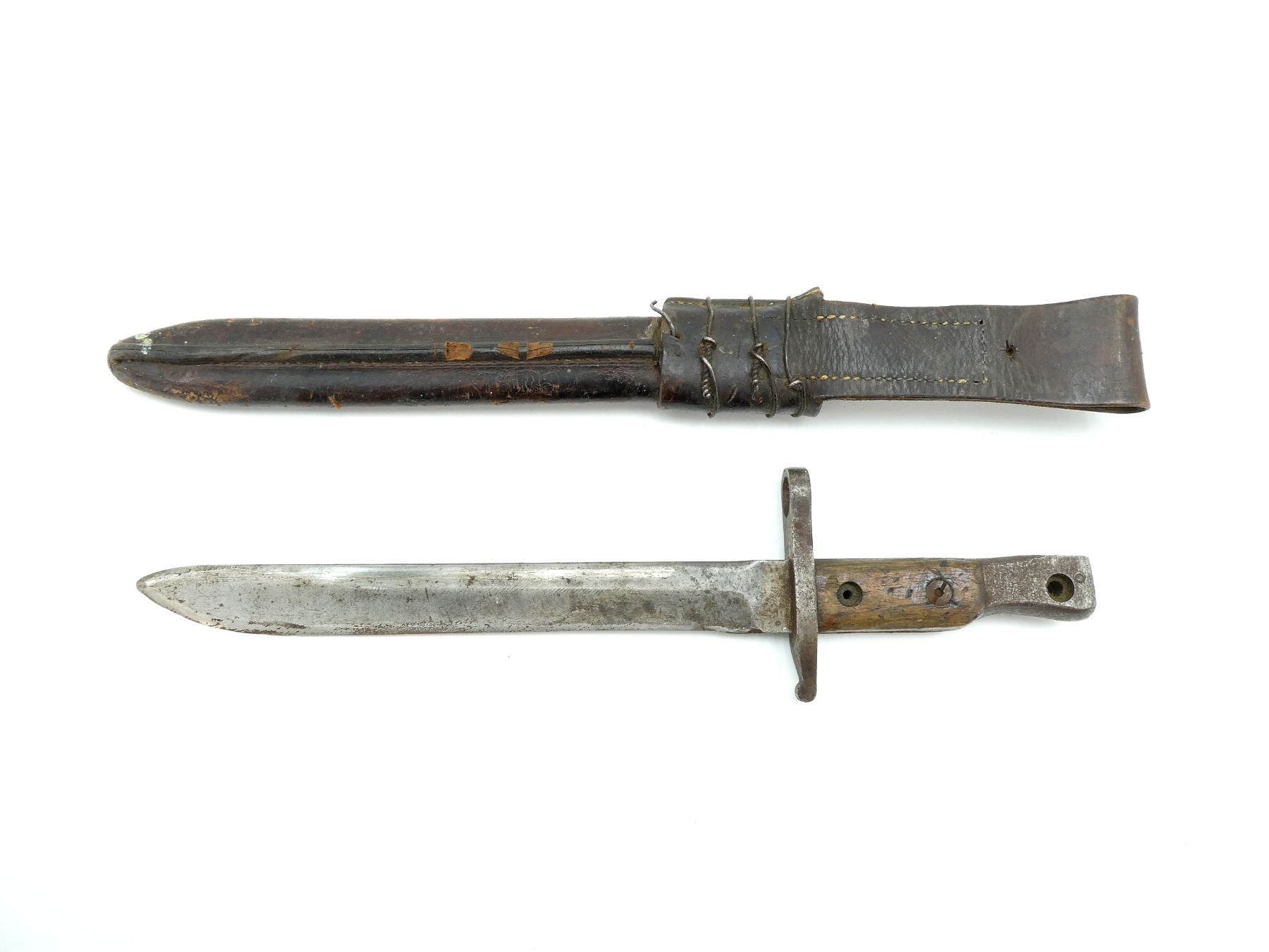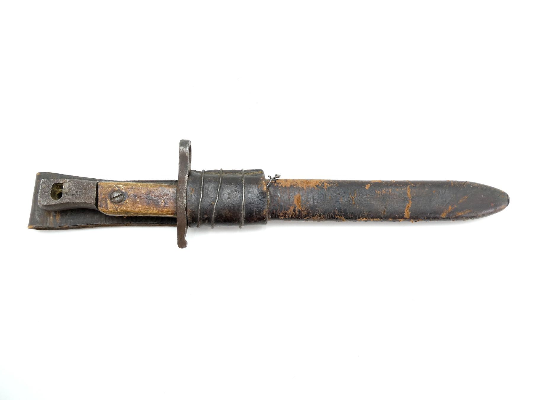 (1) FITS 1910 MKIII RIFLES, WWI MODIFIED BLADE TIP, 2-PIECE WOOD GRIP, METAL POMMEL FAINTLY MARKED: "ROSS RIFLE CO., QUEBEC, PATENTED 1907", MISSING CATCH, BROWN LEATHER & WIRE WRAPPED SCABBARD, MARKED: "MK.I", "1915"& C-BROAD ARROW, BLADE APPROX. 10" & OAL APPROX. 14.5".