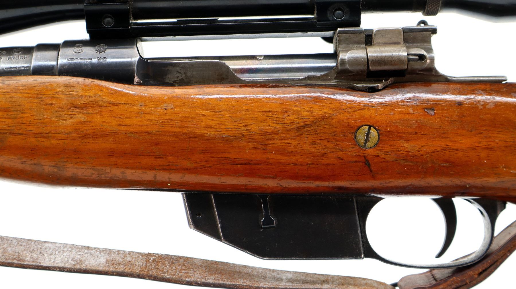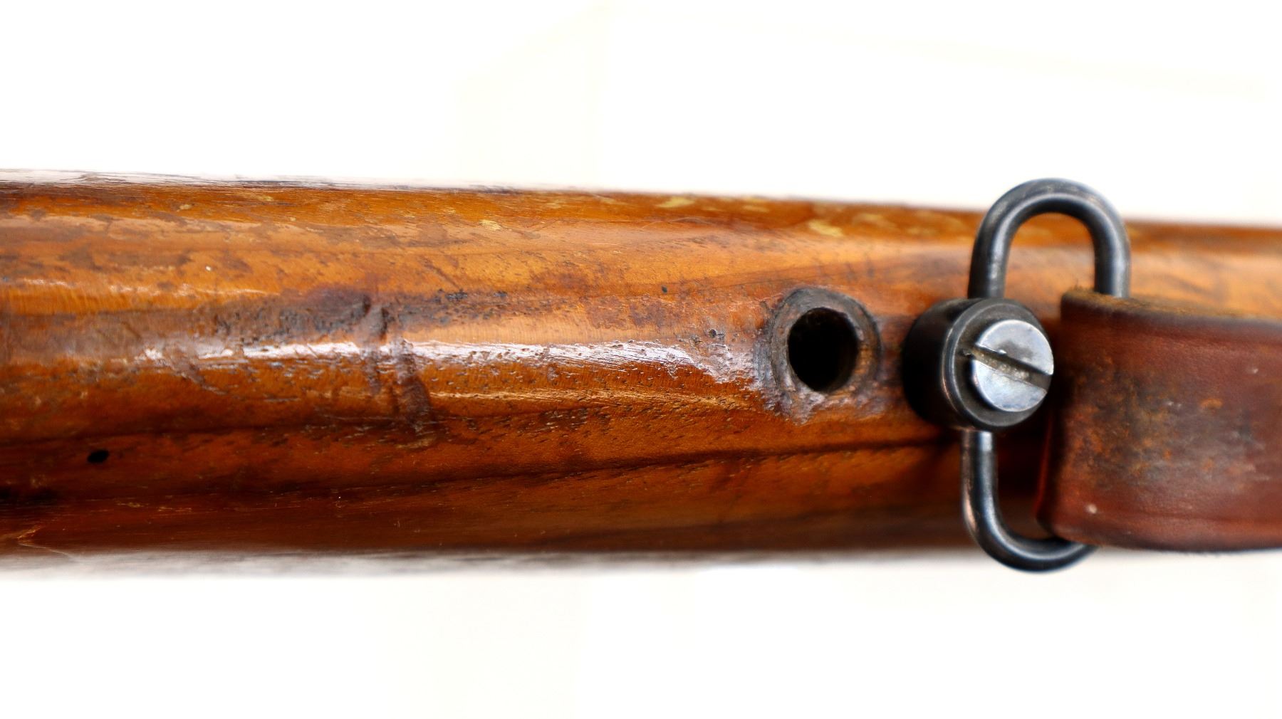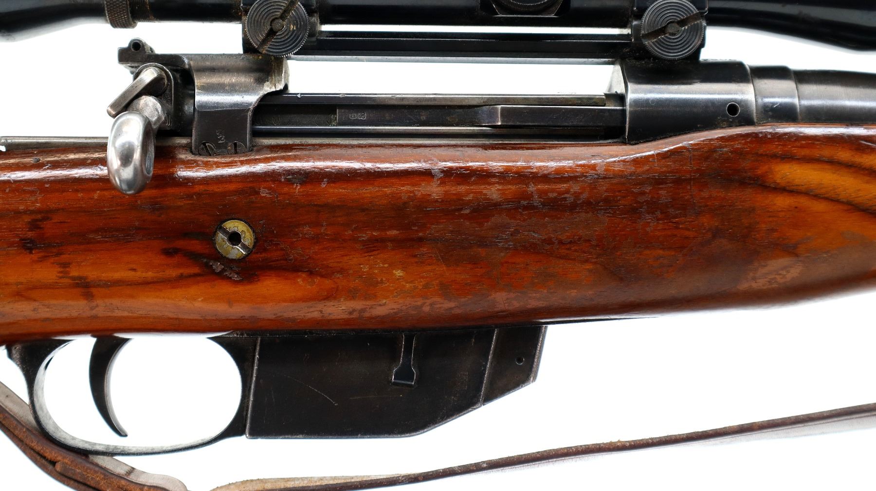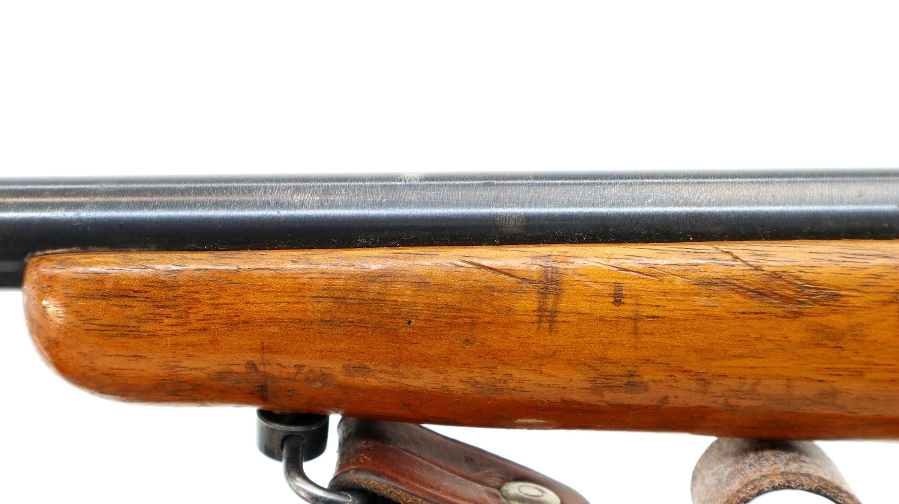 Main Description: Blade front sight with ramp, missing rear sight on barrel and receiver bridge, blued finish, receiver drilled and tapped with Weaver 4x scope installed, clear optics with fine crosshair. Colour case hardened pinned bolt, flag safety. One piece sporterized wood stock, pistol grip, smooth steel butt plate with trap, sling swivels with brown leather sling, butt stock and forend have extra holes in them.