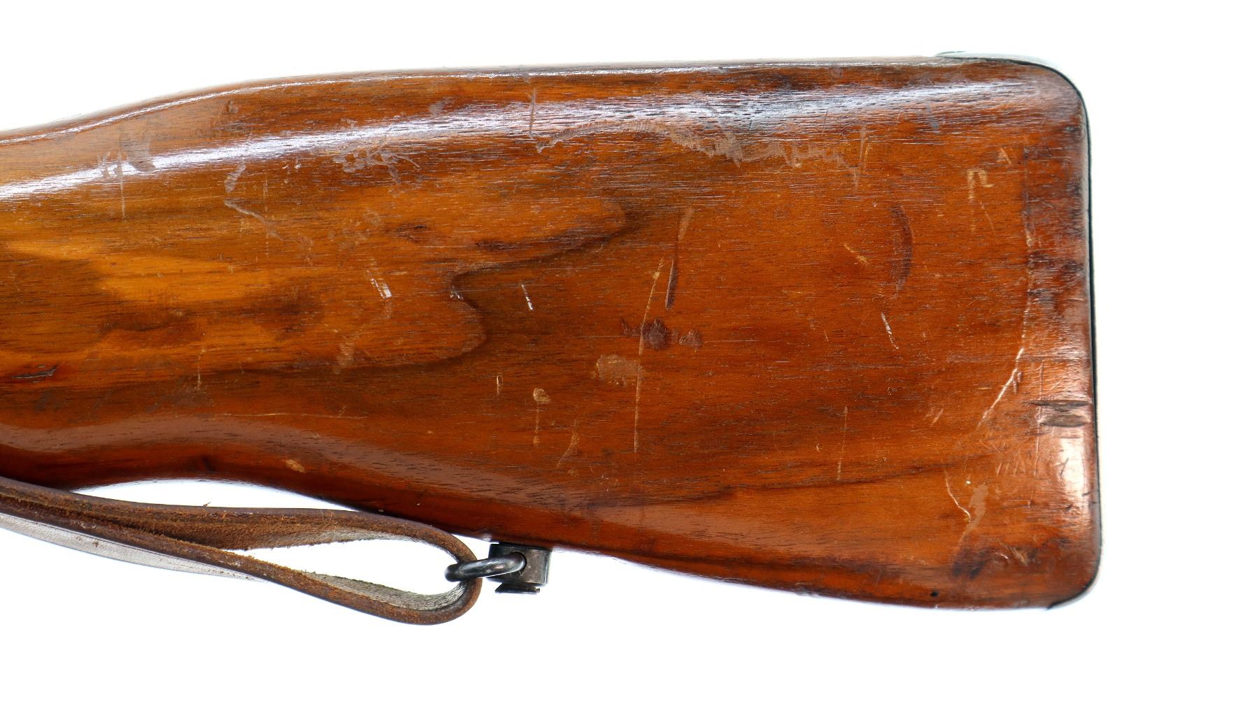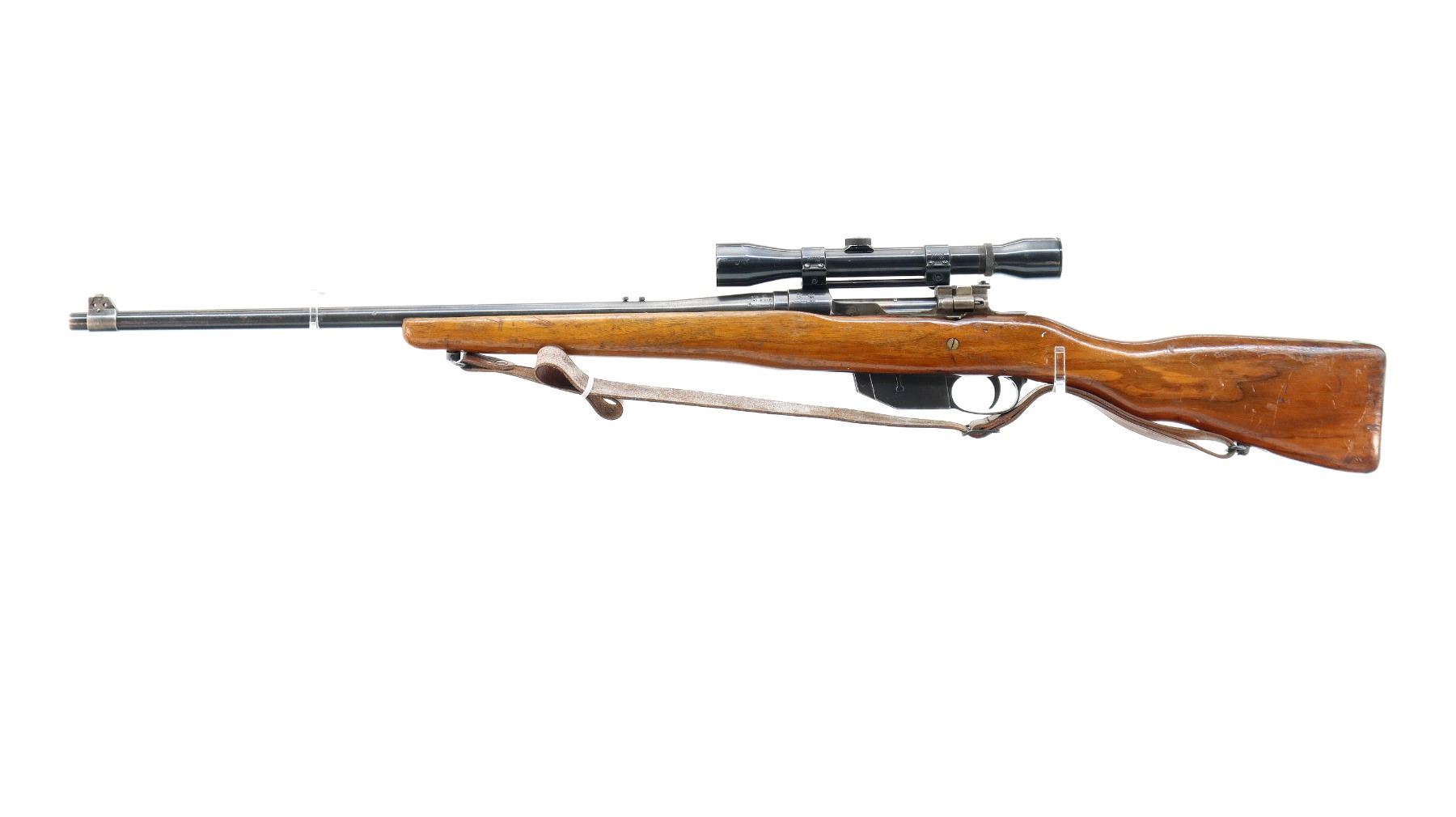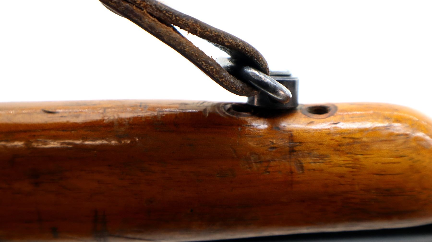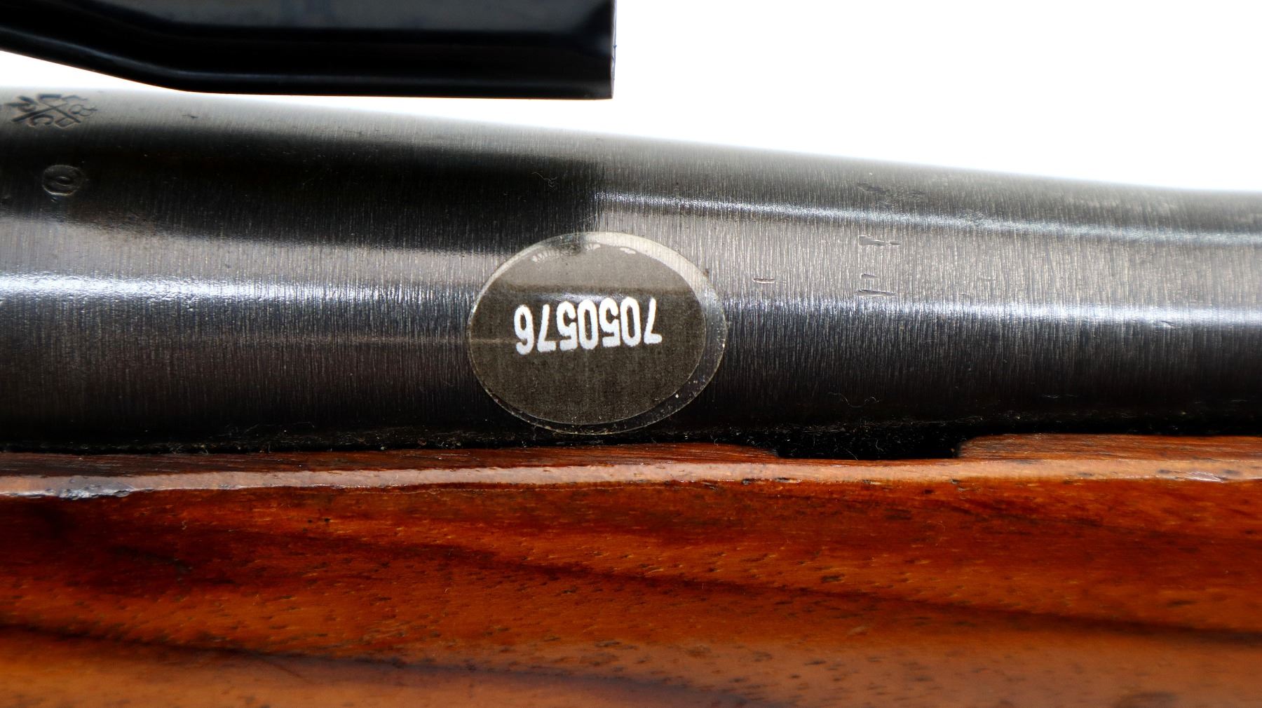 Main Description: Blade front sight with ramp, missing rear sight on barrel and receiver bridge, blued finish, receiver drilled and tapped with Weaver 4x scope installed, clear optics with fine crosshair. Colour case hardened pinned bolt, flag safety. One piece sporterized wood stock, pistol grip, smooth steel butt plate with trap, sling swivels with brown leather sling, butt stock and forend have extra holes in them.