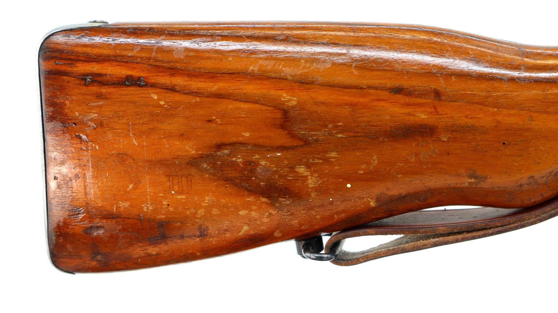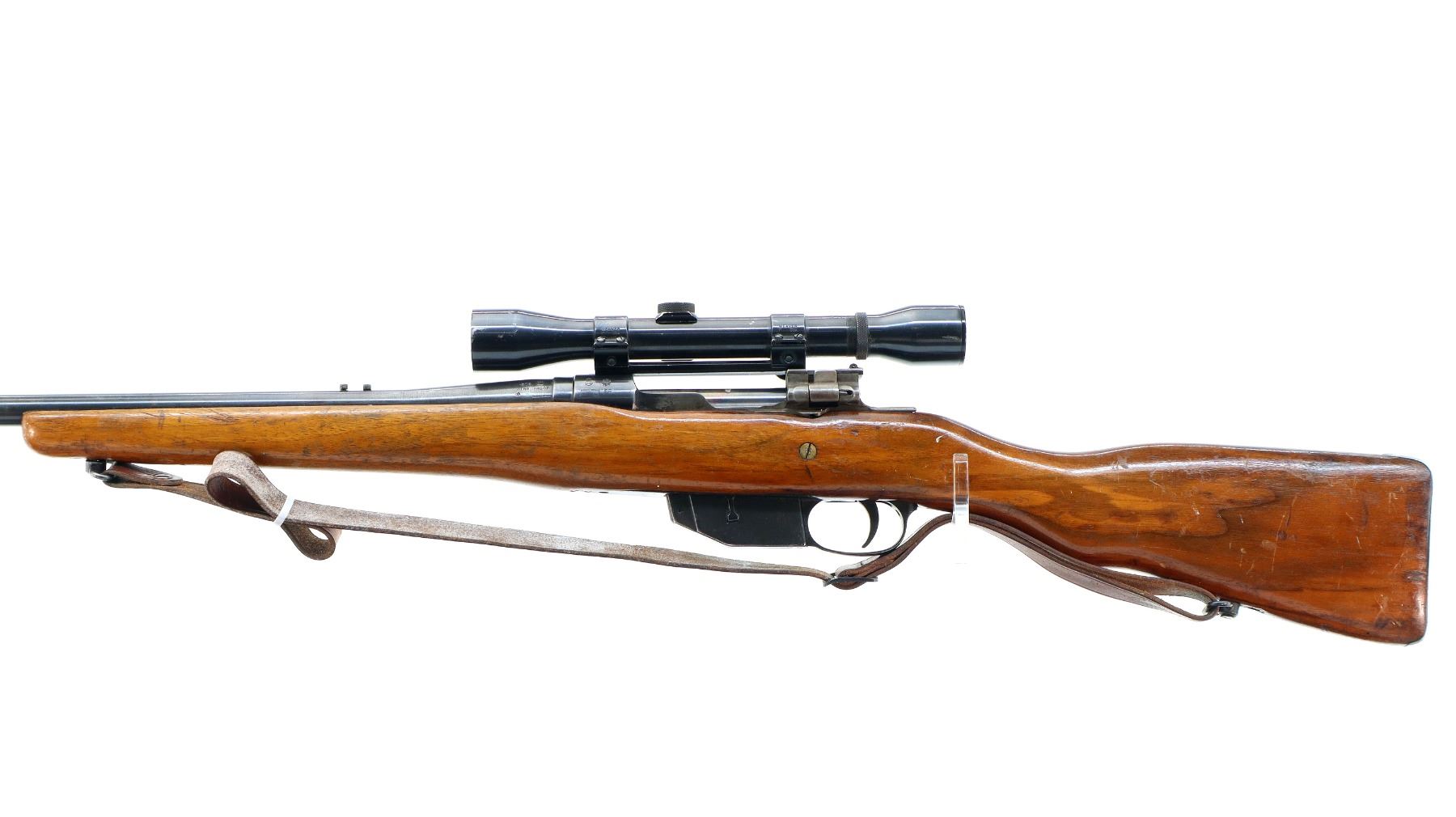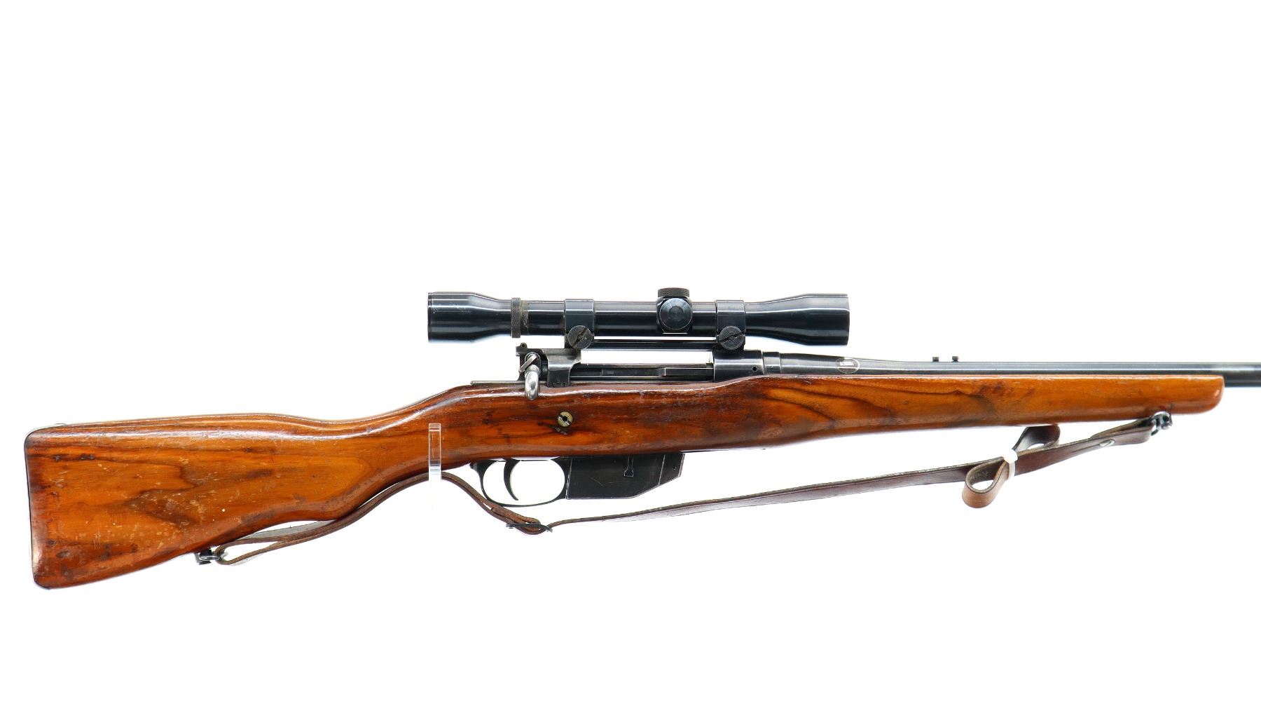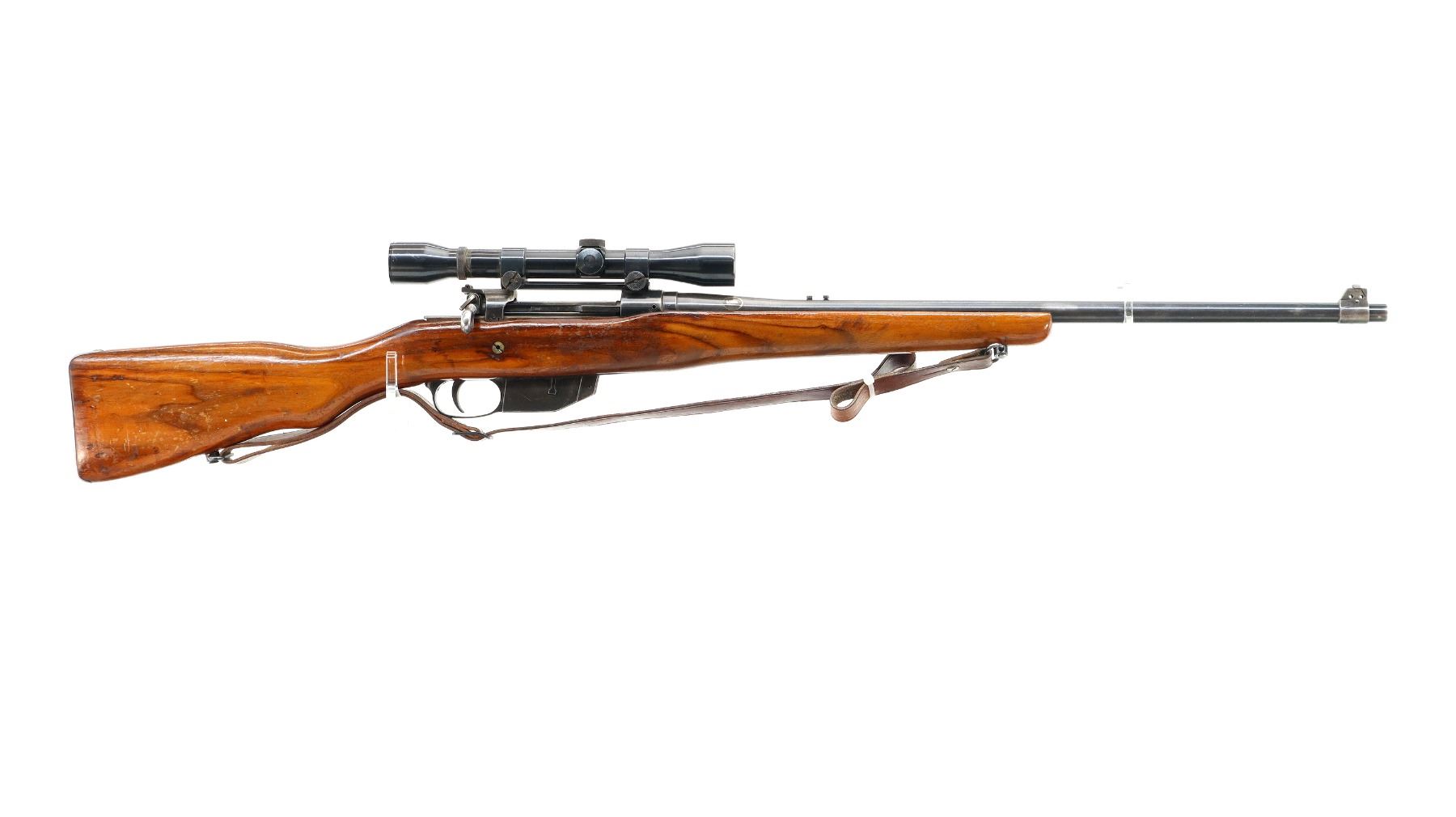 Main Description: Blade front sight with ramp, missing rear sight on barrel and receiver bridge, blued finish, receiver drilled and tapped with Weaver 4x scope installed, clear optics with fine crosshair. Colour case hardened pinned bolt, flag safety. One piece sporterized wood stock, pistol grip, smooth steel butt plate with trap, sling swivels with brown leather sling, butt stock and forend have extra holes in them.