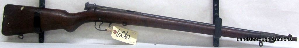 NON RESTRICTED SINGLE SHOT .22, 545MM BARREL. WOOD IS WORN AND HAS VARIOUS STAMPING (INCLUDING QUEBEC STAMP), BLUING IS WORN, BORE IS PITTED