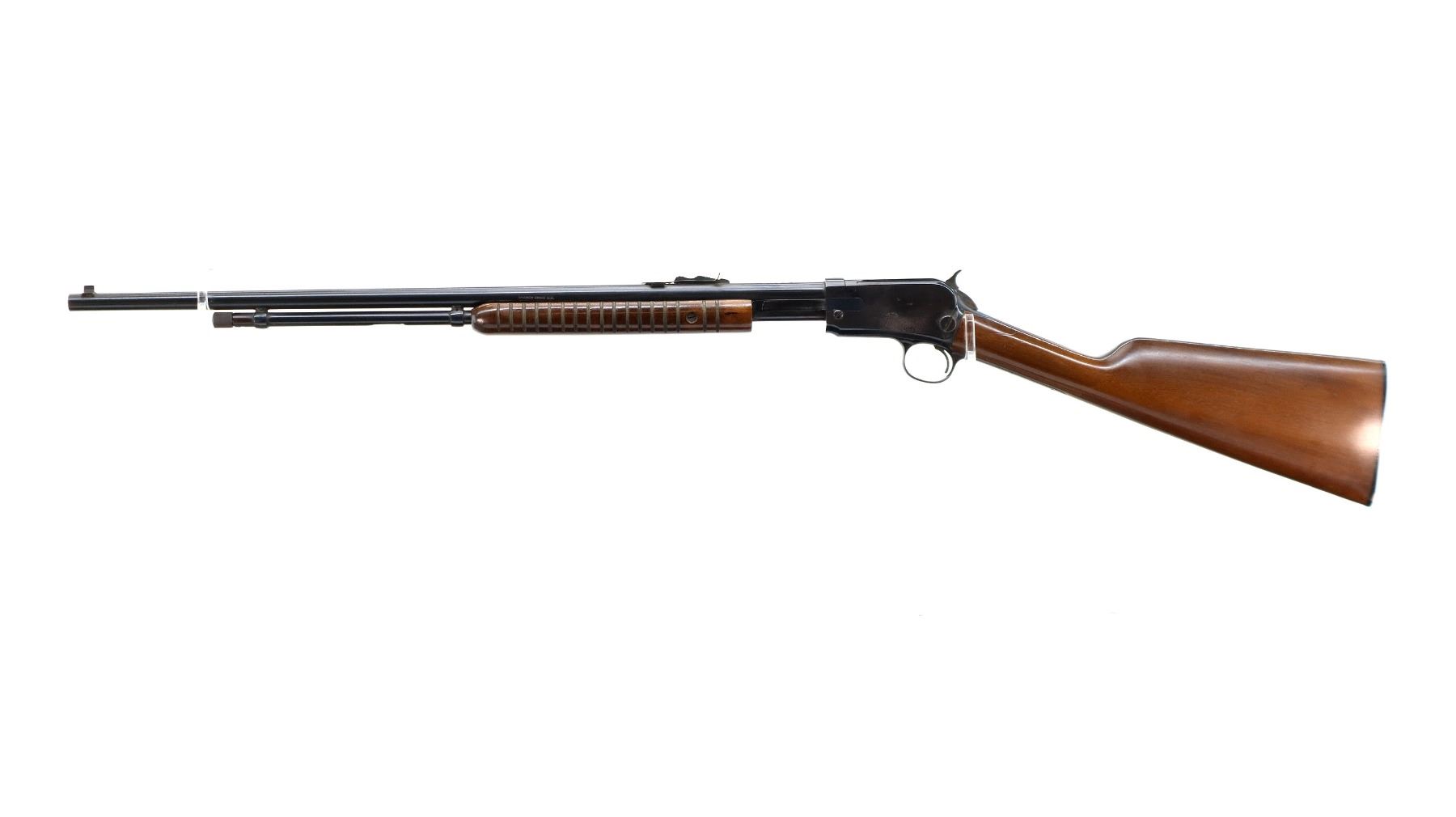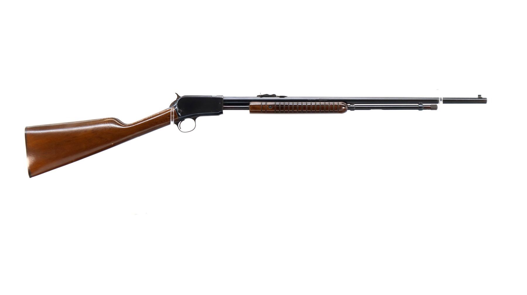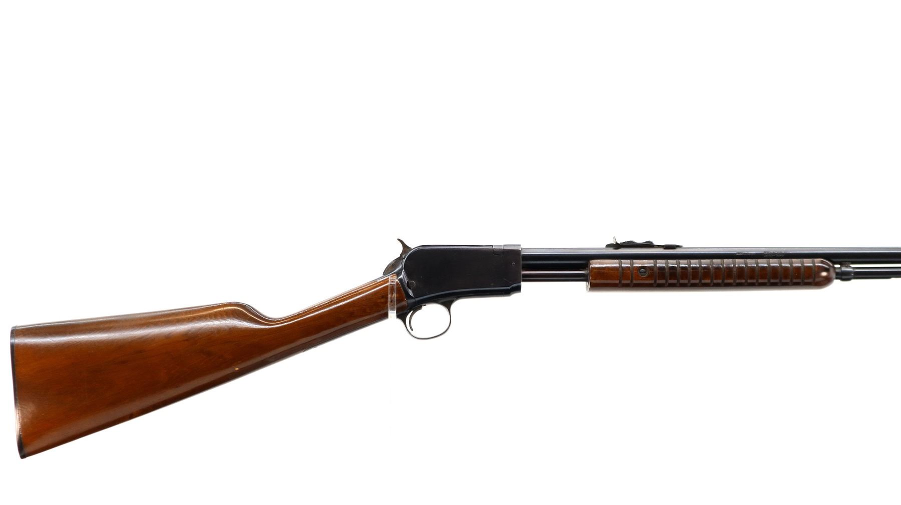 Main Description: Blade front sight, adjustable u notched rear sight, blued finish, grooved spur hammer. Two piece wood stocks, grooved forearm, straight grip, textured black polymer butt plate