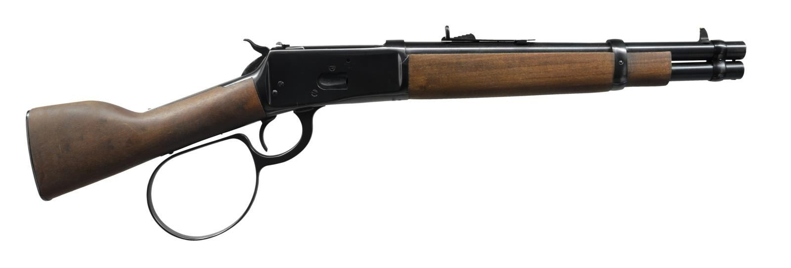 Cal. .45 Colt. S# AM201928. Bbl 12". Blued finish with solid wood furniture. Blade front sight with brass bead and buckhorn rear sight. Saddle ring and enlarged loop lever. CONDITION: Near excellent, exhibiting light thinning on lever from operation of the action. Bright bore, exhibiting a couple small spots of pitting halfway through the barrel and strong rifling throughout. Wood Furniture shows a few minor handling marks, but is otherwise fine. (23-1718/MLW). MODERN. $300-500