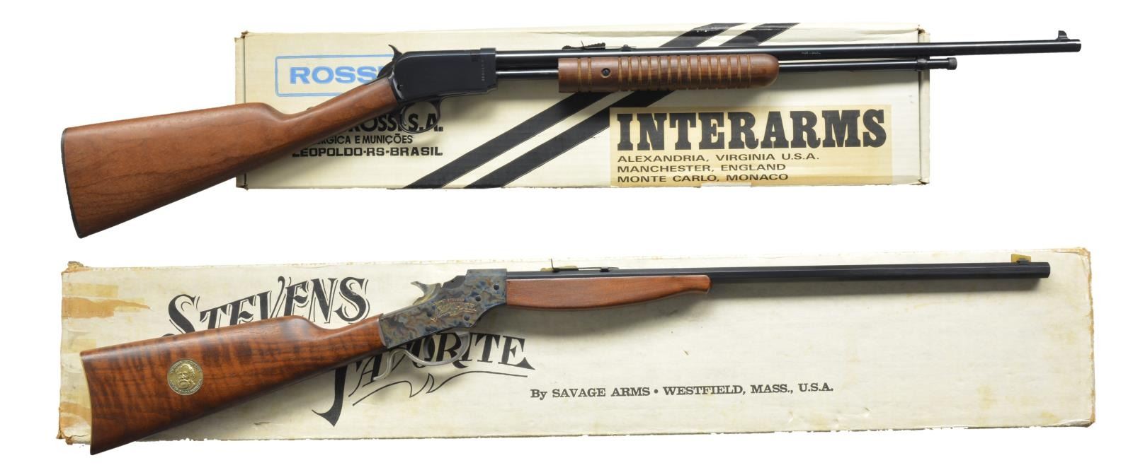 1) ROSSI MODEL 59 GALLERY PUMP. Cal. 22 Mag. S# H018892. Bbl. 23" rnd. w/ blade front sight & elevator adj. sporting rear. Tubular mag. Exposed hammer pump action. Lg. rnd. grooved forearm & straight grip stock w/ plastic buttplate. UNATTACHED ACCESSORIES: original box containing instruction & safety pamphlet. CONDITION: near new retaining 99% wood & metal finish. Near excellent bore. (21-463/DS). 2) SAVAGE / STEVENS JOSHUA STEVENS MODEL 71 FAVORITE COMMERMORATIVE SINGLE SHOT. Cal. 22 S, L, LR. S# 01669SF. Bbl. 22" oct. w/ brass blade Rocky Mountain style front sight & U notch rear sight having brass elevator. Case colored action w/ gold finished hammer & lever. Sides have gold filled markings "STEVENS / FAVORITE". Schnabel tipped forearm & straight grip stock of nicely grained black walnut w/ brass buttplate. Right side of stock has brass medallion w/ portrait of Joshua Stevens "FATHER OF 22 HUNTING". Limited edition of 1,000 mfg. 1971. UNATTACHED ACCESSORIES: foam lined box containing Joshua Stevens tribute, hang tag, registration card, packaging slip & sportsmanship paper. Packing box shows light water damage. CONDITION: bbl. & action retains 99% blue & case colored finish. Plated hammer & lever show finish loss w/ spots of tarnish. Stock medallion in buttplate shows spotted tarnish. Near excellent bore. (21-576/DS). BOTH MODERN. $550-800.
