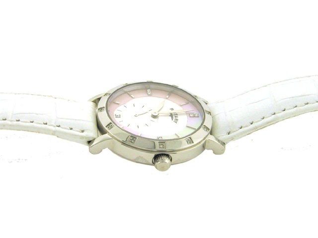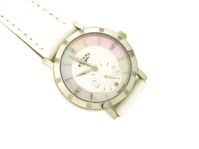 This is a Rotary Rocks Watch with the following features: Diamonds on bezel and markers at 12:00; 3:00; 6:00 and 9:00 position; Mother of Pearl Dial; Swiss made; Water Proof; Stainless steel; and Swiss movement.