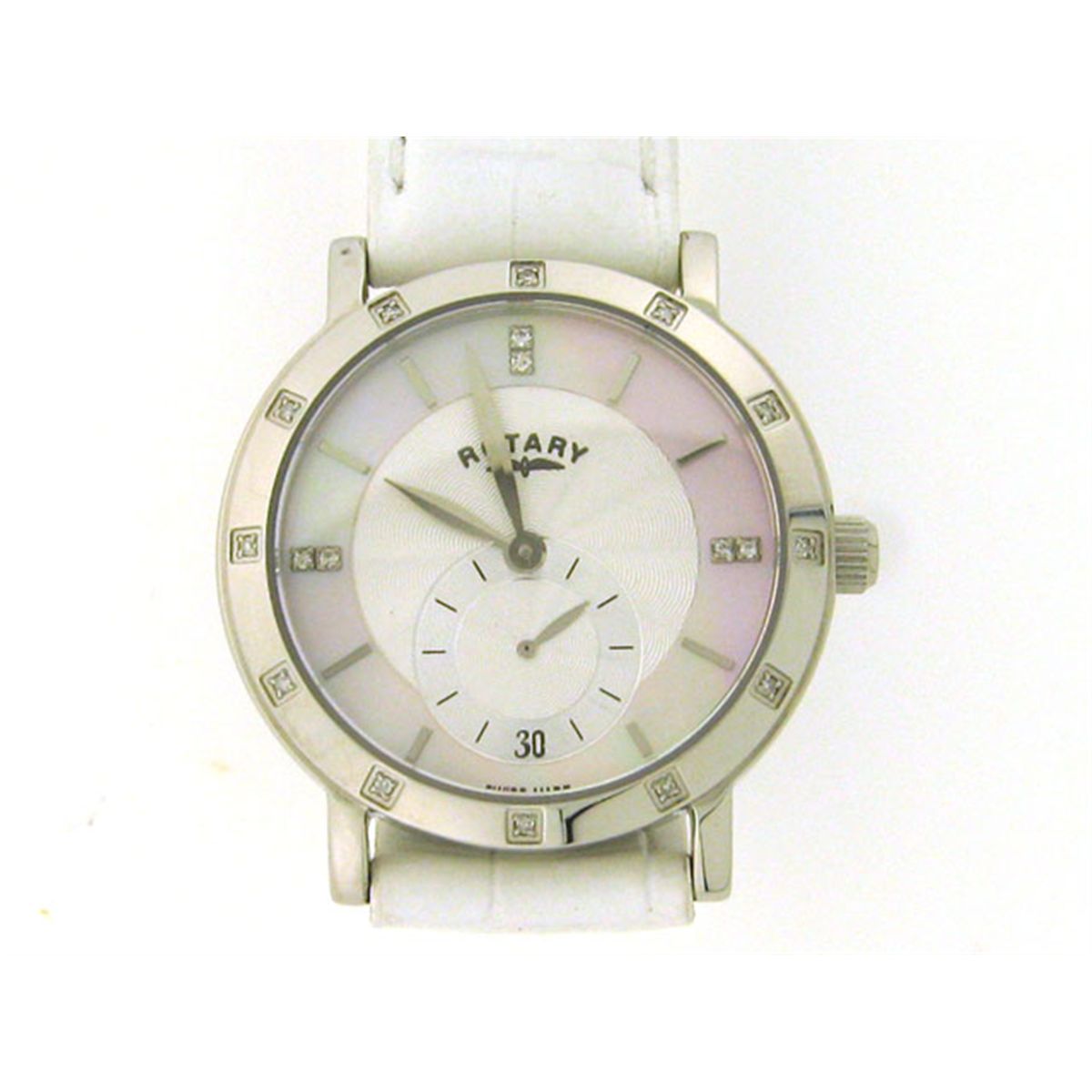 This is a Rotary Rocks Watch with the following features: Diamonds on bezel and markers at 12:00; 3:00; 6:00 and 9:00 position; Mother of Pearl Dial; Swiss made; Water Proof; Stainless steel; and Swiss movement.