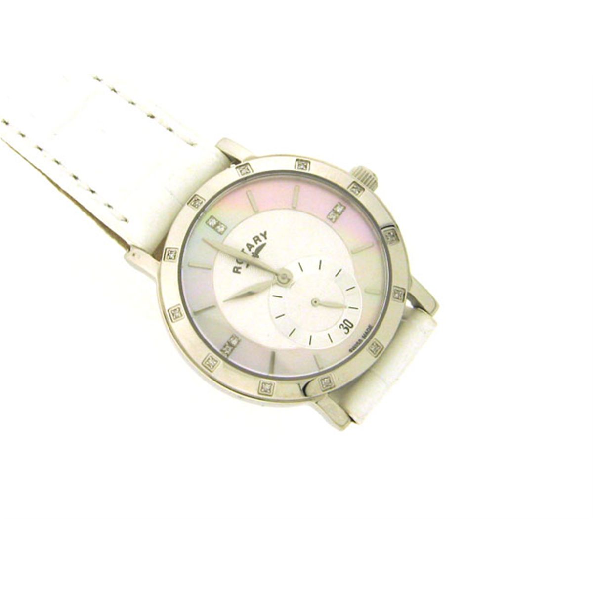 This is a Rotary Rocks Watch with the following features: Diamonds on bezel and markers at 12:00; 3:00; 6:00 and 9:00 position; Mother of Pearl Dial; Swiss made; Water Proof; Stainless steel; and Swiss movement.