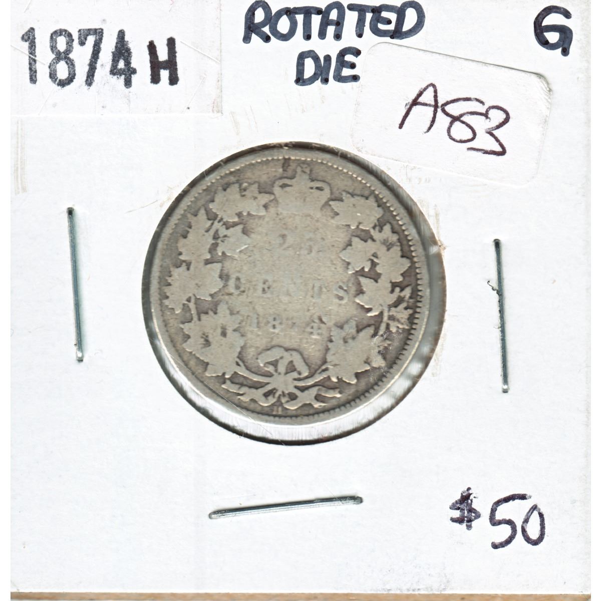 ROTATED DIE ERROR 1874H Canada 25-cent with Rotated Die of about 30%. Buyers Premium will be added on all items as per our terms of sale. We accept Paypal, Credit Card, E-Transfer Payments, Cheque or Money Orders (there is an additional 3% fee for using Paypal or Credit Card). All invoices will be emailed immediately following the auction, please contact us if you would like to pay by credit card or receive a new revised lower total for mailing in payment or sending an e-transfer (3% discount). All Items Are Sold "AS IS", no returns