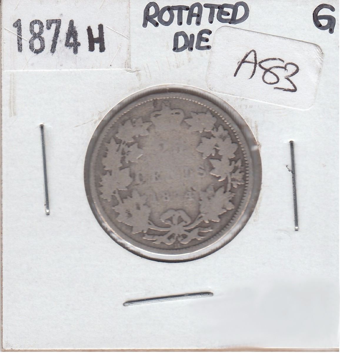 ROTATED DIE ERROR 1874H Canada 25ct with Rotated Die of about 30%.
