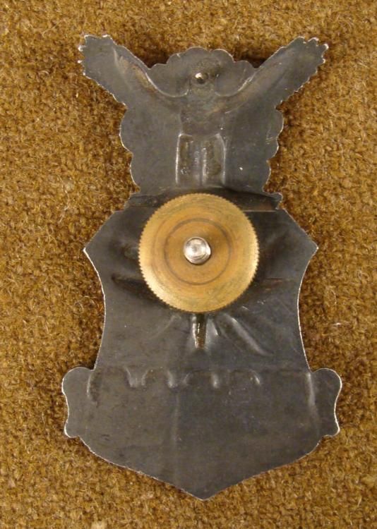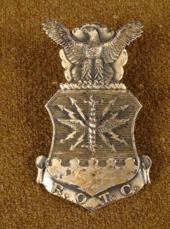 Here is a ROTC Badge, in Silver with Eagle. It dates from around the 1940's. The size is 1 1/2 x 2 1/2". The condition is very good, with surface wear.