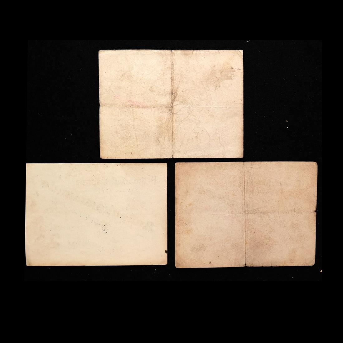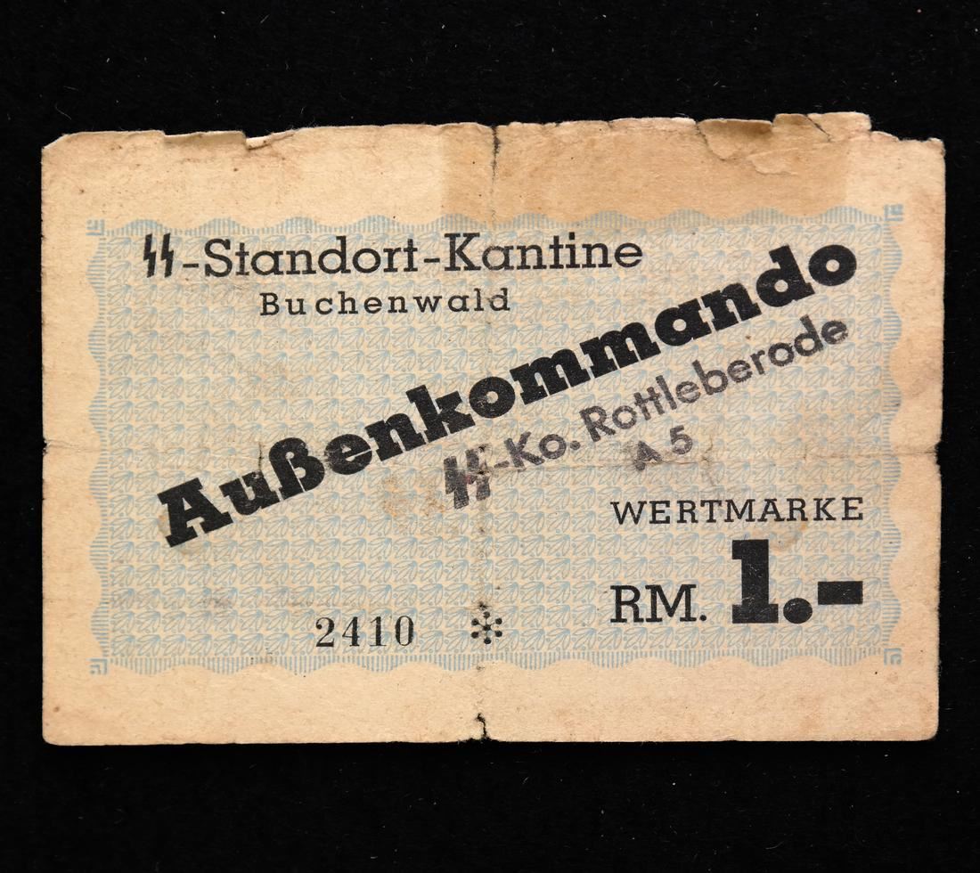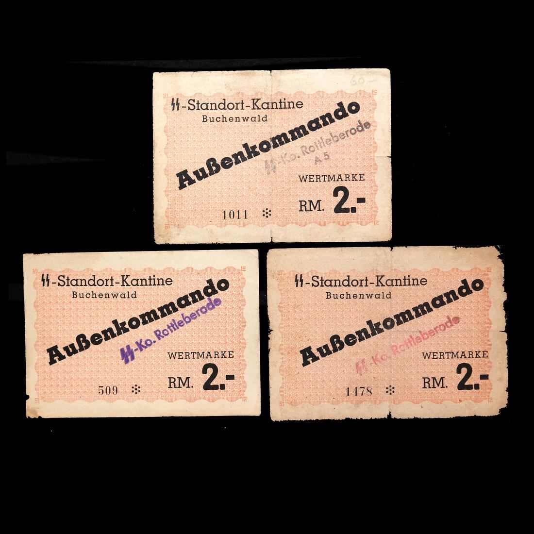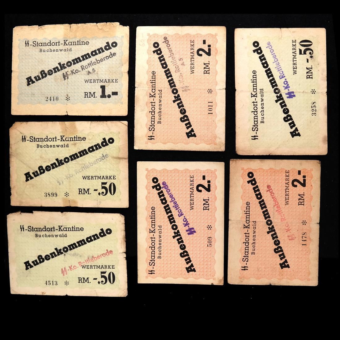 Selection of 7 different violet, red or black overprinted SS-Standort-Kantine / Buchenwald / Auenkommando notes for the Rottleberode sub-camp, 50pf, 1RM and 2RM denominations, mixed condition.