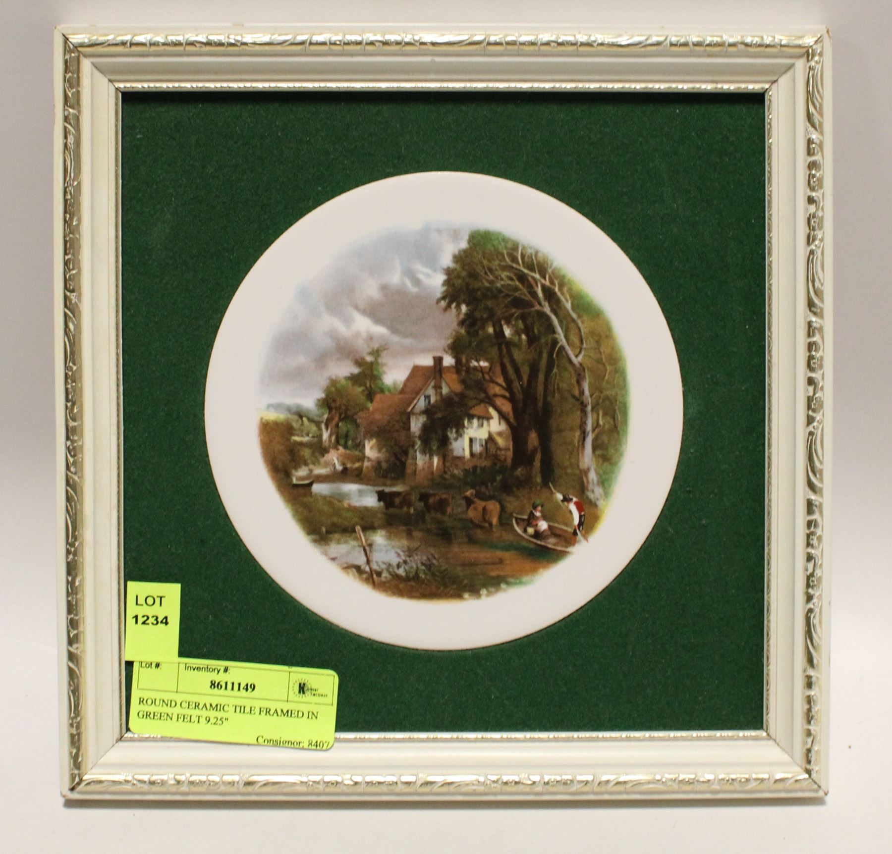 ROUND CERAMIC TILE FRAMED IN GREEN FELT 9.25"