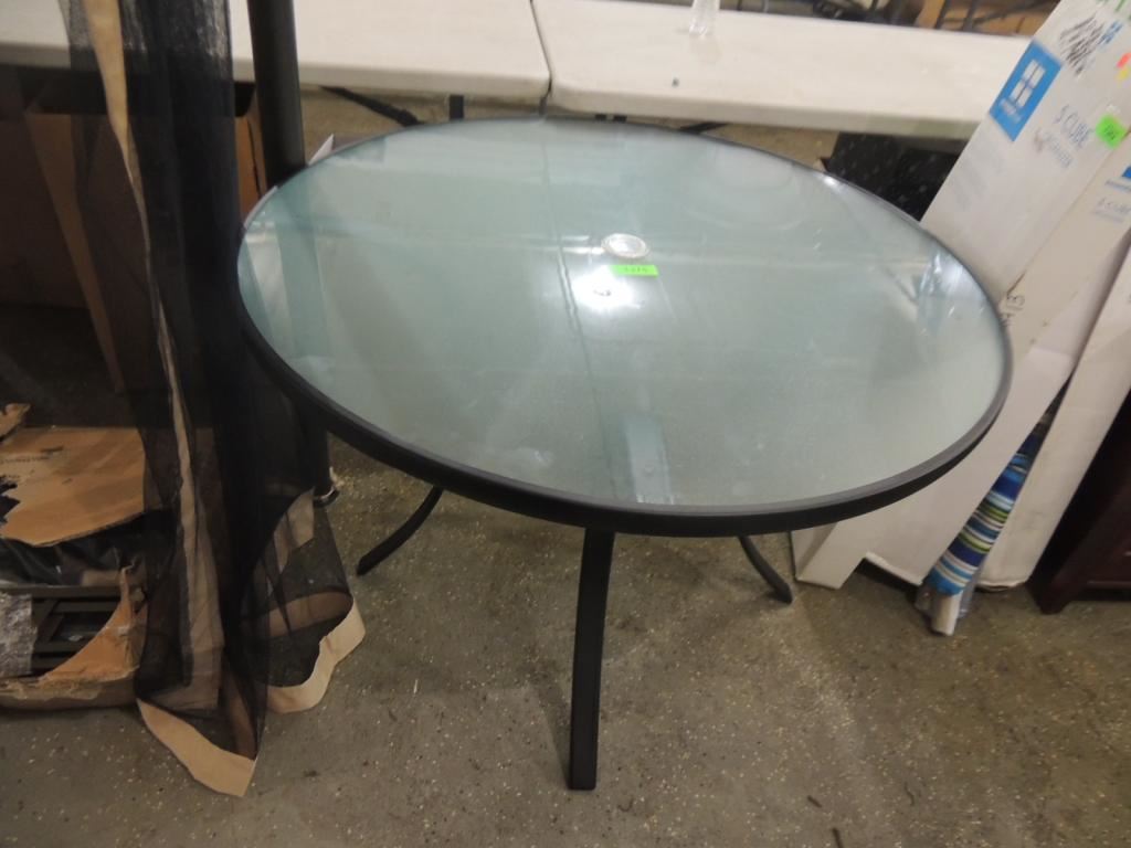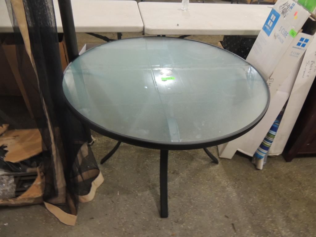 ROUND PATIO TABLE, GLASS TOP PATIO TABLE, OUTDOOR FURNITURE, PATIO FURNITURE AS SHOWN SEE PHOTO FOR MORE DETAILS.