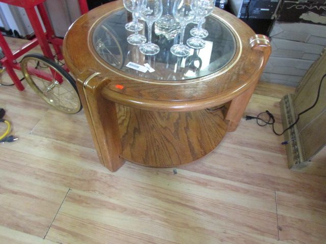 ROUND GLASS TOP & OAK FINISH END TABLE