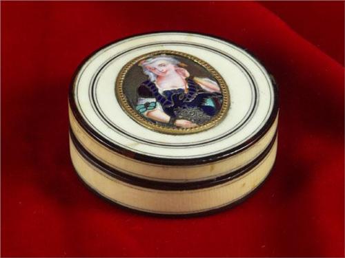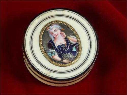 VERTU: Round ivory snuff box with a central portrait of a lady in enamel on silver, tortoise shell lining and friction fitted lid, measures 2 3/8'' x 1''. 2 small cracks on lid, discolored on side of lid. Interior good & bottom. Brown stain on side of base. Enameling in good condition.