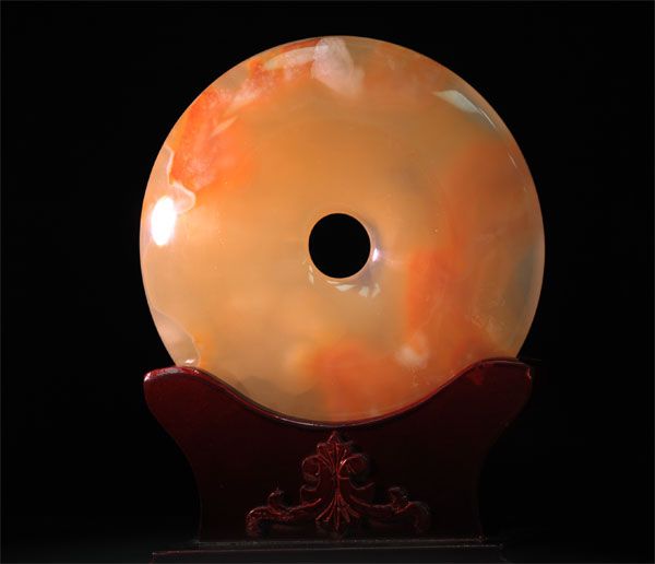 ROUND JADE STATUE WITH ANTIQUE WOOD BASE. **|**|** ROUND JADE; W 7.5 X 7.5IN. THIS JADE COMES WITH A BEAUTIFUL WOOD BASE. ; MSRP: $20000
