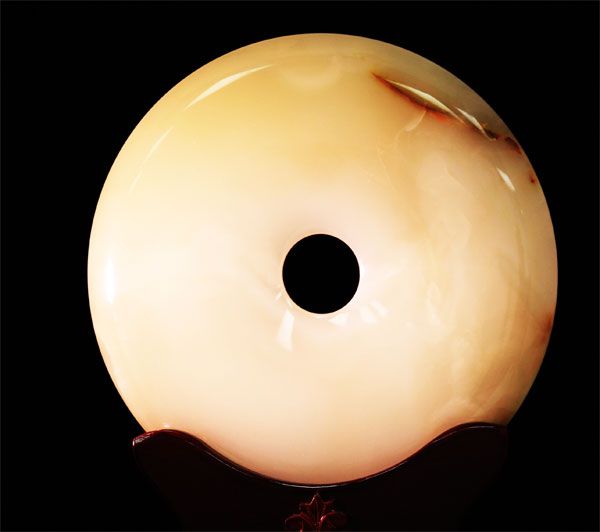 ROUND JADE STATUE WITH ANTIQUE WOOD BASE. **|**|** ROUND JADE; SIZED 9IN; THIS JADE COMES WITH A BEAUTIFUL WOOD BASE. ; MSRP: $15000