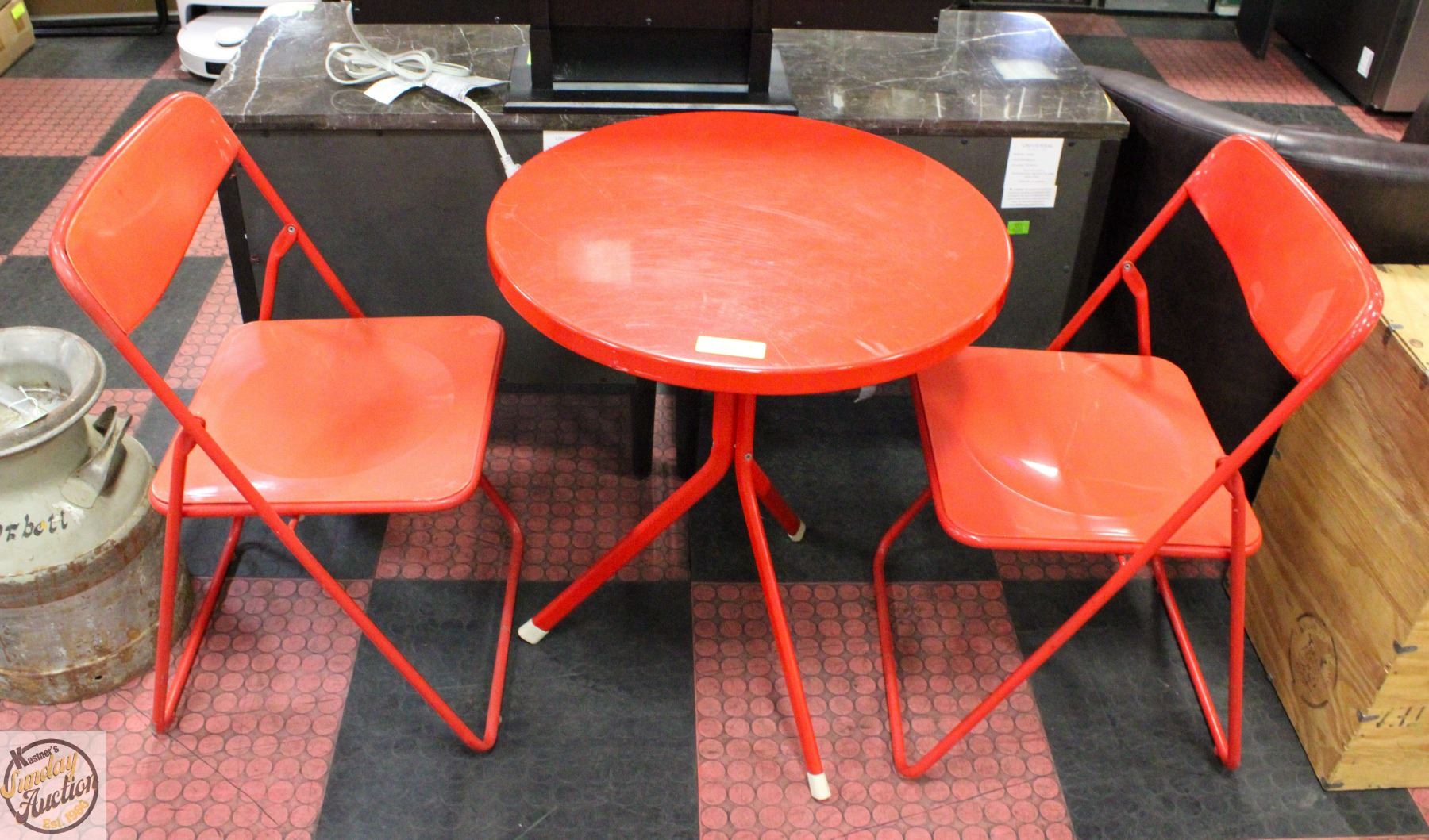 ROUND RED PATIO TABLE AND 2 FOLDING RED CHAIRS