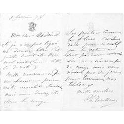 (1812 - 1867) Influential French artist, a leader of the Barbizon school of landscape painters. A.L.S. ""Th. Rousseau"" 2pp. 8vo., [n.p.], Jan. 3, 1878, in French to a gentleman. In part: ""...I didn't sign my last letter, it was too badly written...A thousand thanks from my wife for your lovely souvenir, but you should be in the snow. Poetry is like flowers. That is why yours hasnÆt arrived yet...Here we no snow, but we have no daylight to finish our paintings..."". Boldly written, very good.