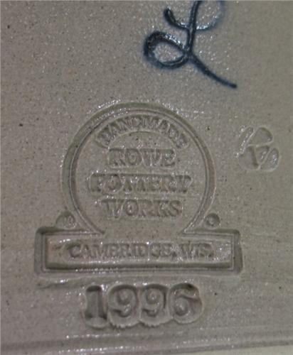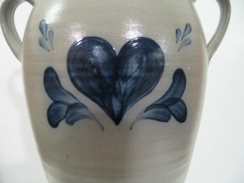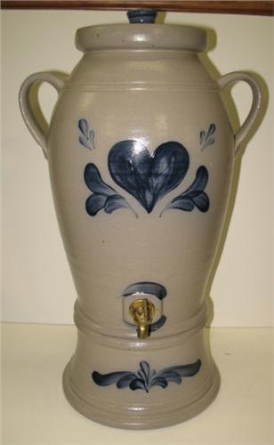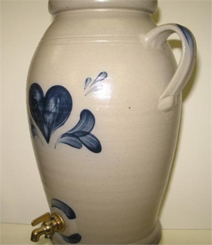 1996 ROWE POTTERY WORKS BLUE DECORATED STONEWARE WATER COOLER. Double-handled with stoneware lid & stoneware pedestal. Cobalt blue brush decorated heart design on front of body. Stamped at bottom on reverse of body “Rowe Pottery Works-1996”. 18.5” H