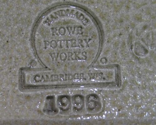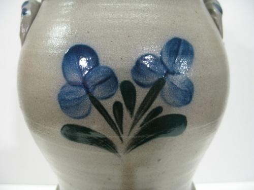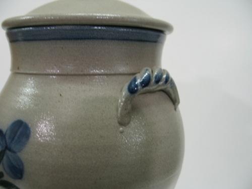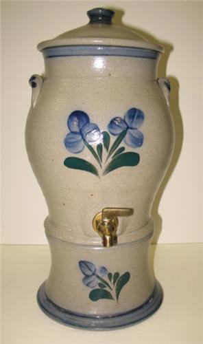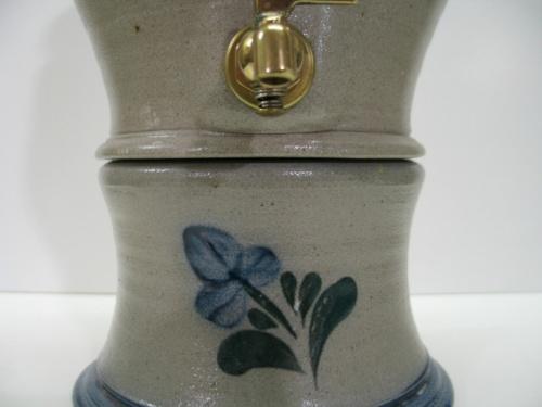 1996 ROWE POTTERY WORKS BLUE DECORATED STONEWARE WATER COOLER. Has rope twisted eared handles and stoneware lid & stoneware pedestal. Cobalt blue and green brush decorated floral design on front of body. Marked at bottom on reverse of body “Rowe Pottery Works-1996”. 15” H