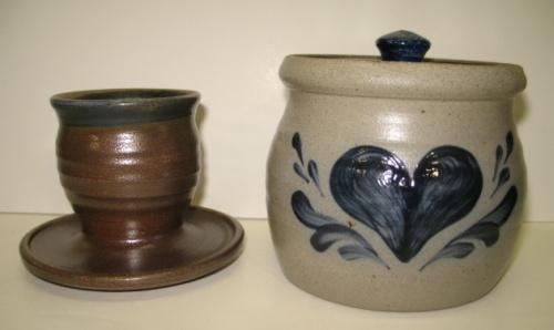 ROWE POTTERY WORKS BLUE DECORATED STONEWARE COVERED CANISTER & CUP. Covered canister has cobalt blue brush decorated heart design on front of body. Stamped at bottom on reverse “Rowe Pottery Works-1995”. 4.5” H. Cup is attached to underplate. No mark. 3.25” H