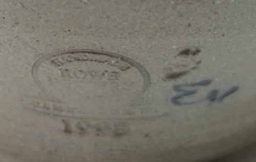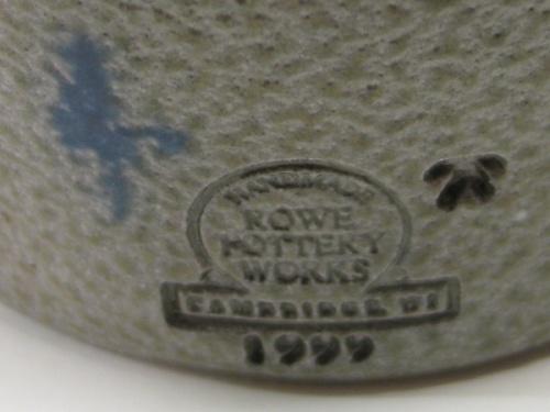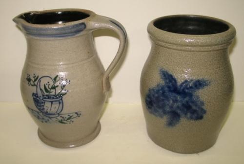 ROWE POTTERY WORKS BLUE DECORATED STONEWARE PITCHER AND CROCK. Pitcher has cobalt blue and green slip decorated basket design on front of body. Stamped beneath handle “Rowe Pottery Works-1998”. 7” H. Crock has cobalt blue brush decorated faded pinecone design on front of body. Stamped at bottom on reverse of body “Rowe Pottery Works-1999”. 6.75” H