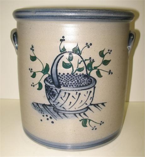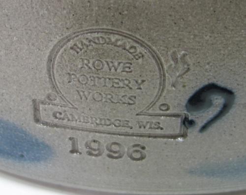 1996 ROWE POTTERY WORKS BLUE DECORATED STONEWARE CROCK WITH EARED HANDLES. 2 gallon. Cobalt blue slip decorated basket design on body. Stamped “2” underneath one handle. Stamped at bottom on reverse of body “Rowe Pottery Works-1996”. 10.25” H
