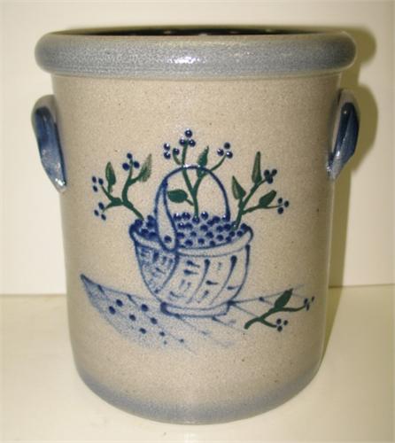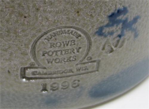 1996 ROWE POTTERY WORKS BLUE DECORATED STONEWARE CROCK. Has eared handles. Cobalt blue and green slip decorated basket design on front of body. Stamped at bottom on reverse of body “Rowe Pottery Works-1996”. 6.5” H