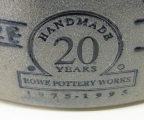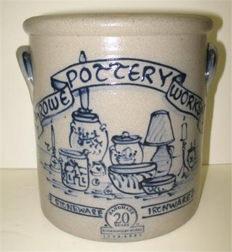 1995 ROWE POTTERY WORKS BLUE DECORATED CROCK. Has eared handles. Cobalt blue slip decorated design on front of body reads “Rowe Pottery Works” and depicts a grouping of crocks. Stamped at bottom “Rowe Pottery Works-20 years-1975-1995”. 8” H