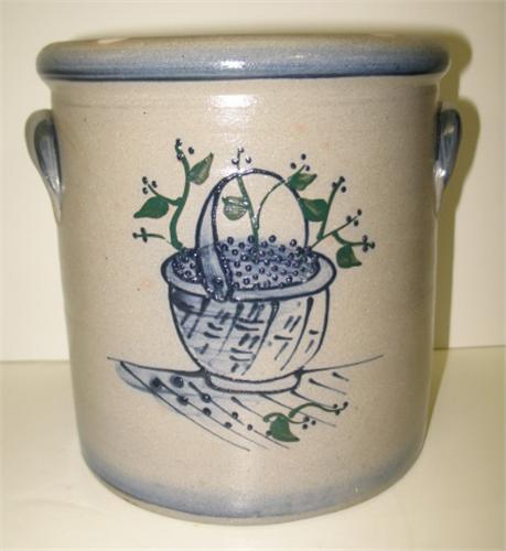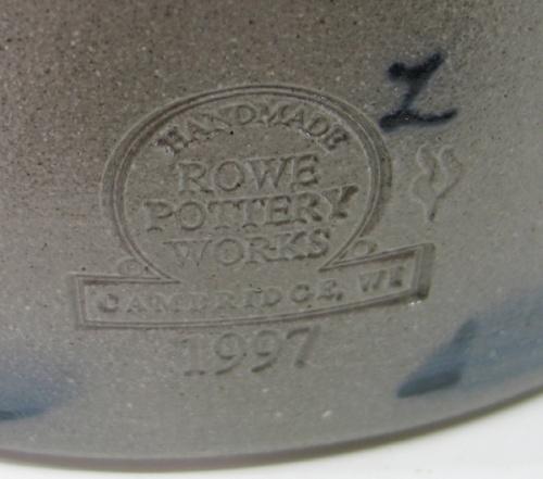 1997 ROWE POTTERY WORKS BLUE DECORATED STONEWARE CROCK. Has eared handles. Cobalt blue and green slip decorated basket design on front of body. Stamped at bottom on reverse of body “Rowe Pottery Works-1997”. 7.75” H