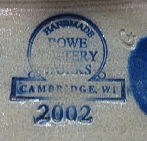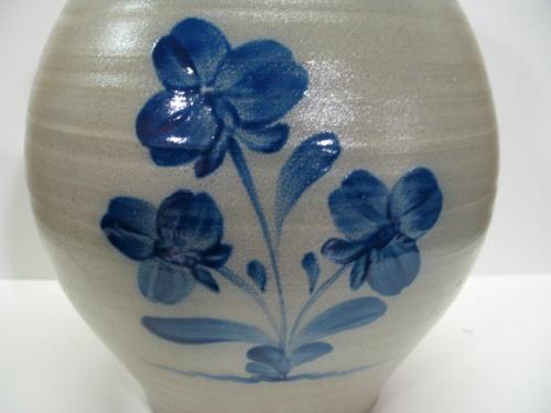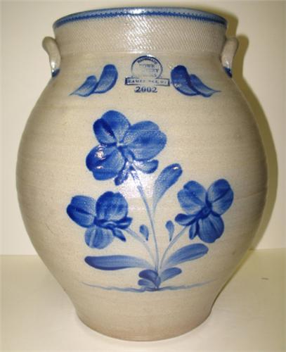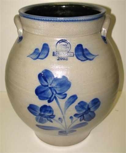 2002 ROWE POTTERY WORKS BLUE DECORATED OVOID STONEWARE CROCK. Has eared handles. Cobalt blue brush decorated floral design on front of body. Stamped above decoration “Rowe Pottery Works-2002”. 13” H