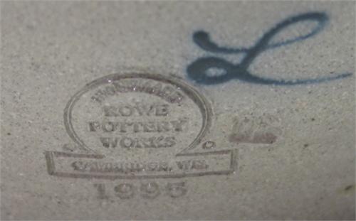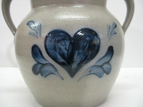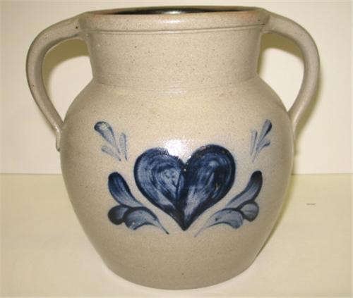 1995 ROWE POTTERY WORKS BLUE DECORATED STONEWARE CROCK. Double-handled. Cobalt blue brush decorated heart design on front of body. Stamped at bottom on reverse of body “Rowe Pottery Works-1995”. 8” H