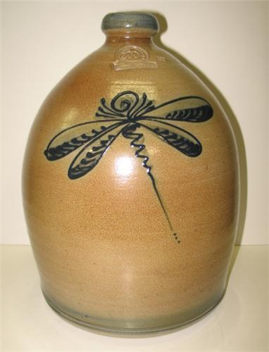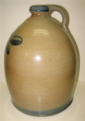 2004 ROWE POTTERY WORKS BLUE DECORATED HANDLED STONEWARE JUG. Cobalt blue slip decorated floral design on body. Stamped at top of body on front “Rowe Pottery Works-2004”. 12” H