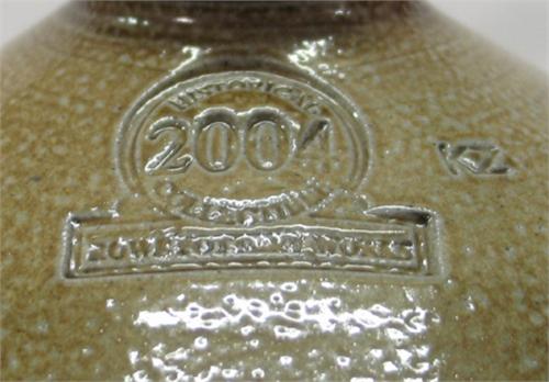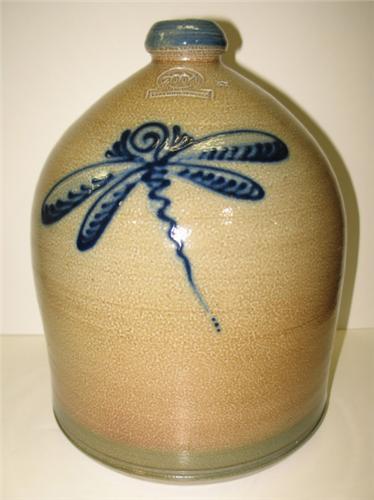 2004 ROWE POTTERY WORKS BLUE DECORATED HANDLED JUG. Cobalt blue slip decorated floral design on front of body. Stamped at top near spout “Rowe Pottery Works-2004”. 12” H