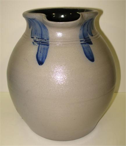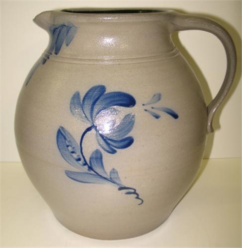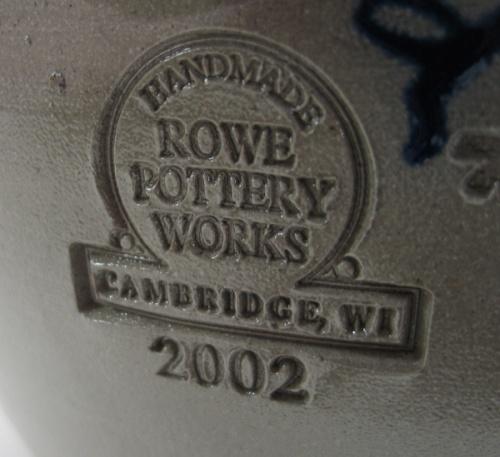 2002 ROWE POTTERY WORKS BLUE DECORATED OVOID STONEWARE PITCHER. Cobalt blue brush decorated floral design on front of body. Stamped at bottom of handle “Rowe Pottery Works-2002”. 10” H