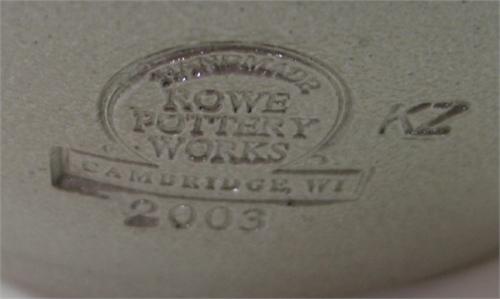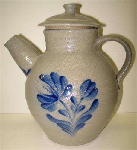 2003 ROWE POTTERY WORKS BLUE DECORATED HANDLED OVOID CROCK WITH SPOUT AND LID. Cobalt blue brush decorated floral design on front of body. Stamped at bottom beneath handle “Rowe Pottery Works-2003”. 10.5” H