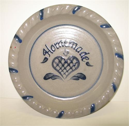 1997 ROWE POTTERY WORKS BLUE DECORATED STONEWARE PIE PLATE. Cobalt blue brush decorated design around outer rim and heart design in center. Blue text in center reads “Homemade”. Stamped on exterior of side “Rowe Pottery Works-1997”. 10.25” Dia.