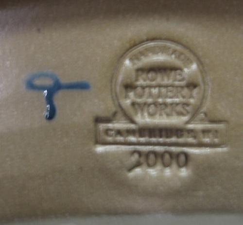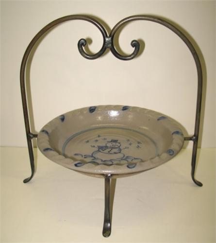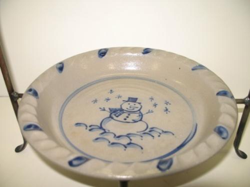 2000 ROWE POTTERY WORKS BLUE DECORATED STONEWARE PIE PLATE & HOLDER. Cobalt blue slip decorated snowman decoration in center. Stamped on exterior of side of plate “Rowe Pottery Works-2000”. 10.25” Dia.