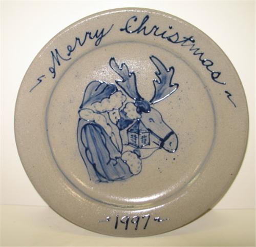 1997 ROWE POTTERY WORKS BLUE DECORATED STONEWARE CHRISTMAS PLATE. Cobalt blue slip decorated design in center of Santa and reindeer. Blue text around border reads “Merry Christmas-1997”. Marked on bottom “Rowe Pottery Works”. 10.75” Dia.