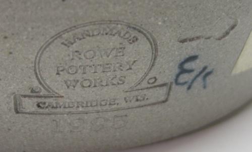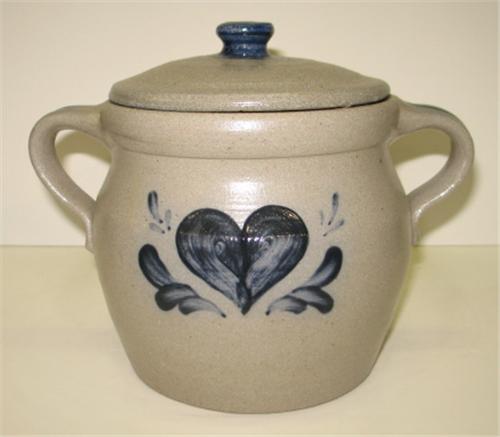 1995 ROWE POTTERY WORKS BLUE DECORATED STONEWARE BEAN POT WITH LID. Cobalt blue brush decorated heart design on front of body. Stamped at bottom on reverse of body “Rowe Pottery Works-1995”. 7.5” H