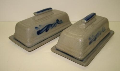 PAIR OF ROWE POTTERY WORKS BLUE DECORATED STONEWARE COVERED BUTTER DISHES. Cobalt blue brush decorated designs on lids. Both are stamped on bottom “Rowe Pottery Works”. 7” L, 3.25” H
