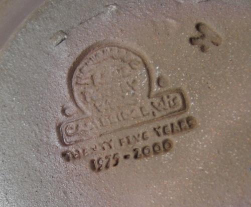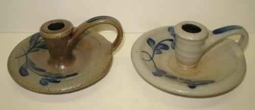 PAIR OF ROWE POTTERY WORKS BLUE DECORATED STONEWARE CHAMBERSTICKS. Both have cobalt blue brush decorated floral designs. One is stamped on bottom “Rowe Pottery Works-1989” and the other is stamped “Rowe Pottery Works-Twenty-Five Years-1975-2000”. 2.75” H