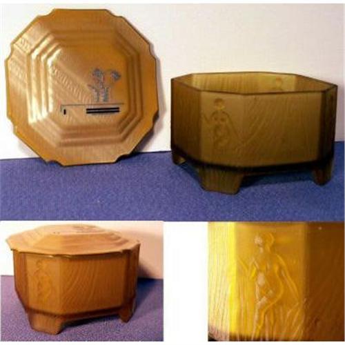 <table width="100%" border="0" cellspacing="0" cellpadding="4"><tr><td><em> </em></td></tr><tr> <td width="100%"> Known as Roxana and shown on page 43 of Whitmyer - Bedroom & Bathroom Glassware of the Depression Years. The honey amber four footed base has eight panels which alternate in size, the four smaller are adorned with an embosed nude, the four larger panels are embosed with sweeping vertical lines that produce a wood grain effect. The lovely Art Deco lid is celluloid. Measuring about 4" x 4" x 3" tall this jar and lid are in excellent condition. </td></tr><tr> <td> </td></tr><tr> <td>Reference #: tsARSGPJ</td></tr><tr><td>Condition:Excellent</td></tr><tr><td>Year:1930s</td></tr><tr><td>Title:ROXANA Amber Satin Glass Powder Jar</td></tr><tr><td>Location:Orlando, Florida</td></tr></table>