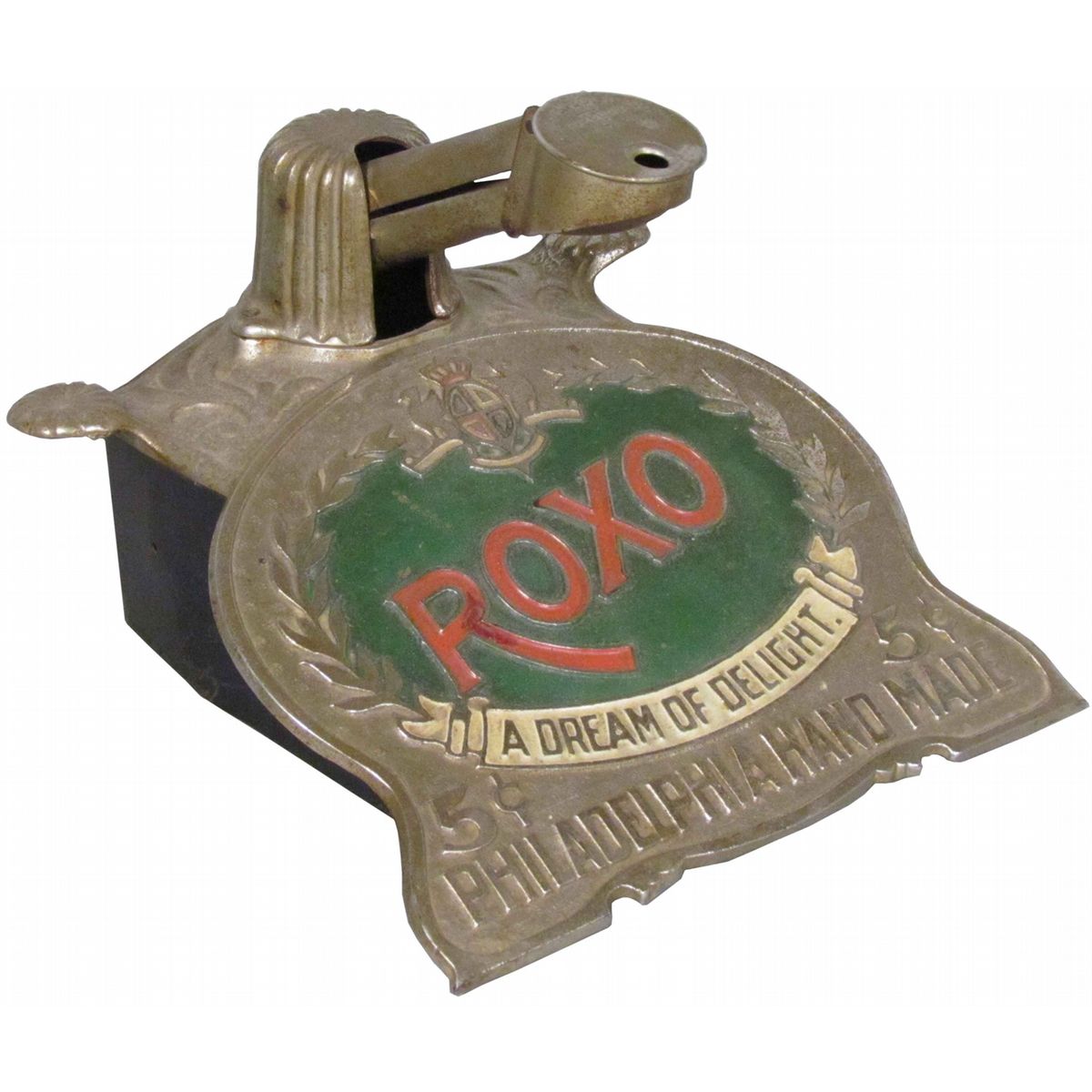 ROXO Cast Iron Cigar Tip Cutter. The Brunhoff Mfg. Co. Patent date 1902. Wear to nickel and enamel otherwise good condition. 7 X 6 X 7 1/2 inches.
